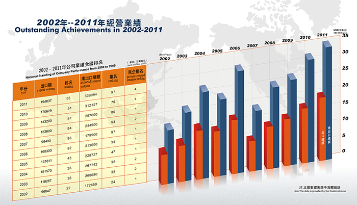 近年來,公司發展勢頭良好, 2014年公司實際出口額達到10.5億美金,排名“2014中國出口200強”第192名,其中民營企業排名第21名。公司先后獲得 “中國守合同重信用企業”、 “廣東省先進集體”、“廣東省優秀民營企業”、“東莞市50強民營企業”,“東莞市文明單位”等稱號,公司被東莞市政府授予“東莞市50強民營服務業企業”光榮稱號,公司董事長陳海生被授予“東莞市優秀民營企業家”光榮稱號。